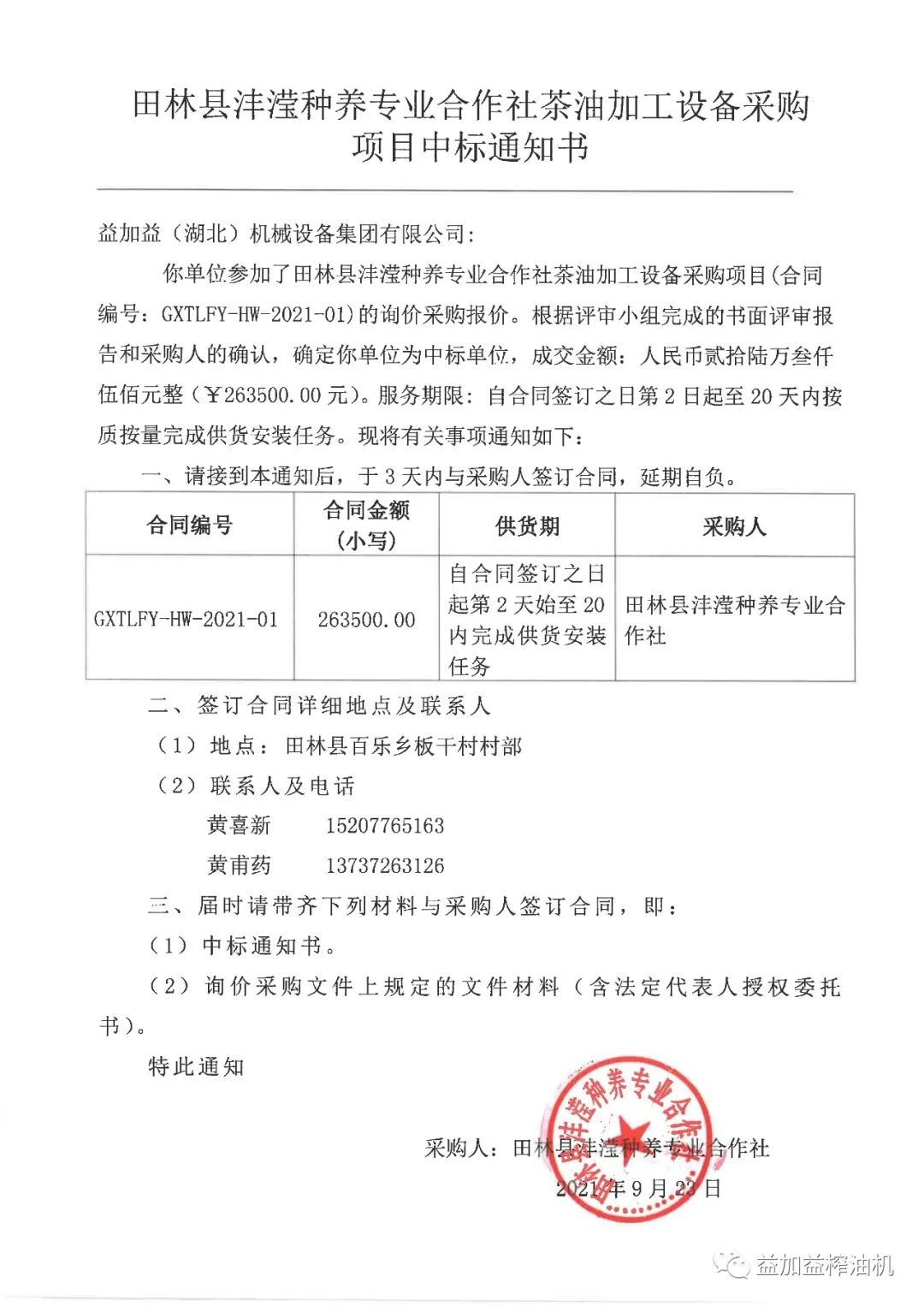 益加益集團(tuán)憑借過(guò)硬的產(chǎn)品質(zhì)量,扎實(shí)高效的工作作風(fēng),卓越的運(yùn)作團(tuán)隊(duì)和良好的企業(yè)信譽(yù),在眾多競(jìng)爭(zhēng)對(duì)手中脫穎而出,連續(xù)中標(biāo)《中華人民共和國(guó)世界銀行貸款廣西貧困片區(qū)農(nóng)村扶貧試點(diǎn)示范項(xiàng)目》中全部11家專業(yè)合作社山茶油加工設(shè)備的招標(biāo)購(gòu)置。