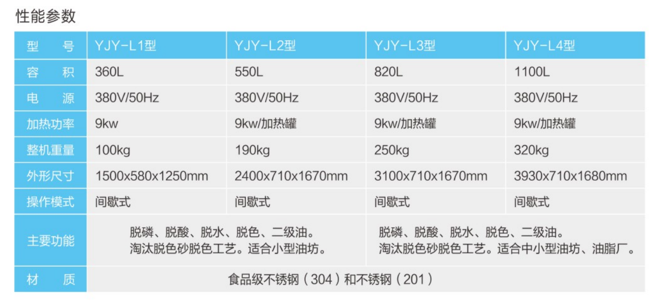 脫磷、脫酸、脫水、脫色、脫堿味。淘汰使用脫色砂脫色工藝。適合小型油坊。
